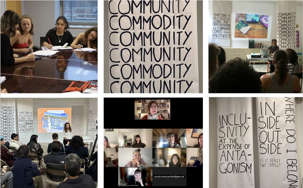 Over the years, Leave the Community Alone has evolved through multiple formats: it has been presented as a lecture at › Bard College in (NY), and › Manchester Metropolitan University of Art (UK), as a seminar at the › School of Making Thinking (NY), and as a workshop at › Storm Bookstore and at › Residency Unlimited in Brooklyn (NY).